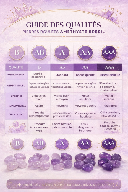 Ten ametyst, sklasyfikowany jako klasa A , to kamień dobrej jakości , oferujący piękną równowagę między estetyką, regularnością i atrakcyjnością wizualną. Każda partia zawiera asortyment unikalnych kamieni naturalnych, z niewielkimi różnicami w kształcie, rozmiarze i kolorze, które dodają im naturalnego uroku.