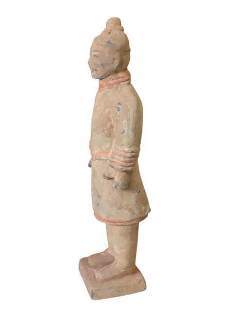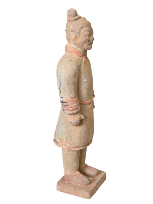 Wojownik w stroju bojowym: Te posągi reprezentują jedną z kategorii żołnierzy wśród posągów armii terakotowej. Zazwyczaj przedstawiani są jako żołnierze ubrani w proste stroje bojowe. W porównaniu z innymi typami wojowników terakotowych, często mają mniej wyposażenia i dekoracji. Żołnierze ci byli prawdopodobnie zwykłymi piechurami, pełniącymi wartę i inne ogólne zadania wojskowe, a nie wyższymi rangą dowódcami czy członkami sił specjalnych. Ich wizerunek może odzwierciedlać typowy wizerunek zwykłych żołnierzy w starożytnej armii chińskiej – w prostych strojach, ale z niezachwianą odwagą i determinacją.