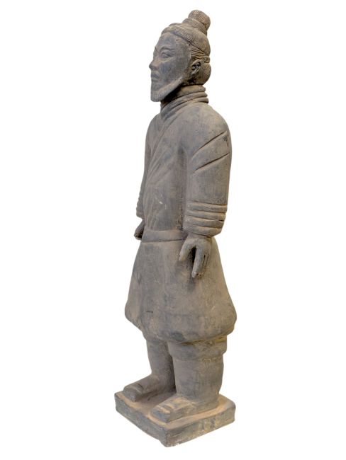 Wojownik w stroju bojowym: Te posągi reprezentują jedną z kategorii żołnierzy wśród posągów armii terakotowej. Zazwyczaj przedstawiani są jako żołnierze ubrani w proste stroje bojowe. W porównaniu z innymi typami wojowników terakotowych, często mają mniej wyposażenia i dekoracji. Żołnierze ci byli prawdopodobnie zwykłymi piechurami, pełniącymi wartę i inne ogólne zadania wojskowe, a nie wyższymi rangą dowódcami czy członkami sił specjalnych. Ich wizerunek może odzwierciedlać typowy wizerunek zwykłych żołnierzy w starożytnej armii chińskiej – w prostych strojach, ale z niezachwianą odwagą i determinacją.