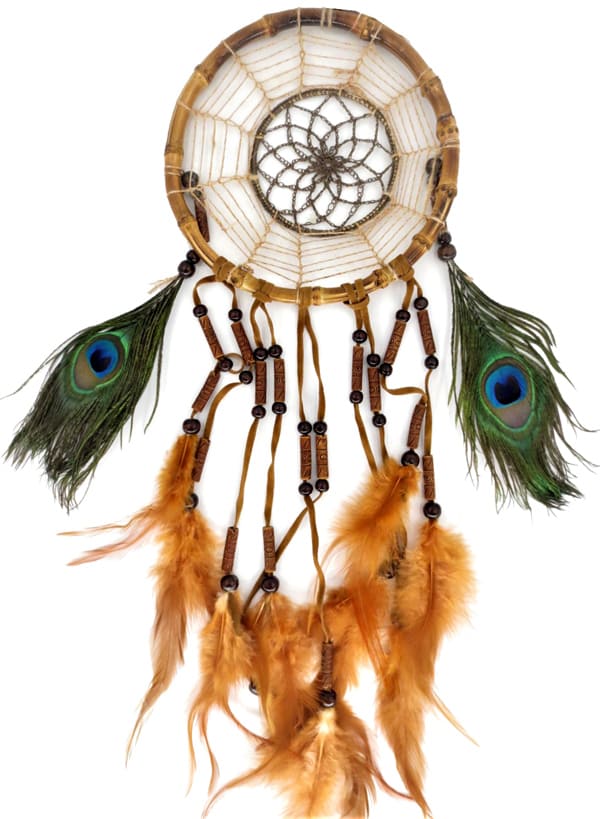 Łapacz snów bambusowy turkusowy i pawie pióra 17cm