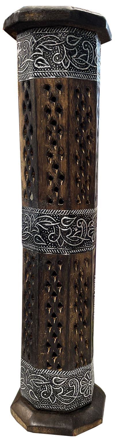 Drewniany stojak na kadzidełko ośmiokątna wieża z 3 grawerowanymi metalowymi paskami 30cm