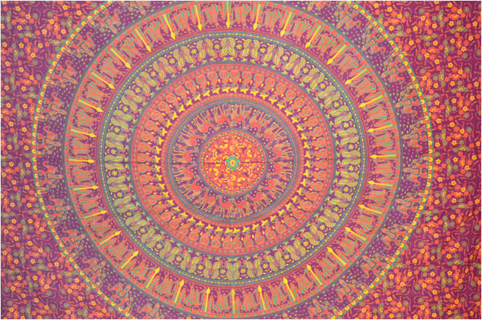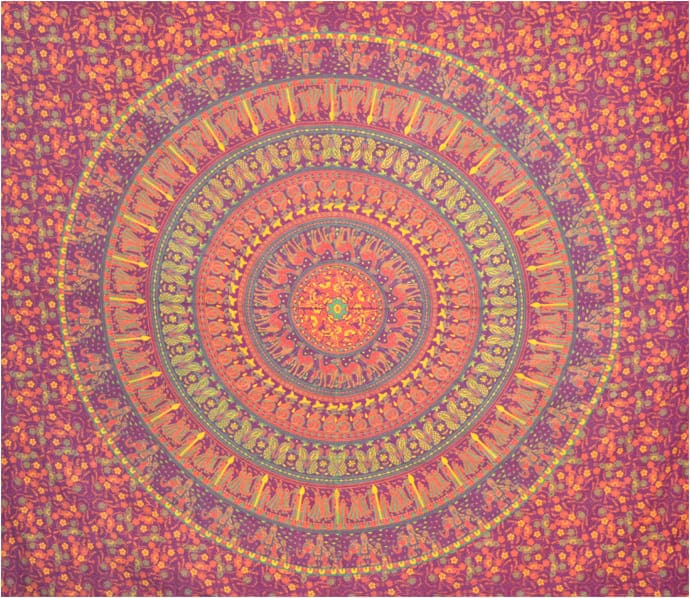Gobelin mandala słonie i wielbłądy bordowy pomarańczowy zielony i żółty