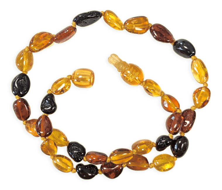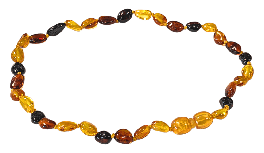 Naszyjnik dla dziecka pop z bursztynu bałtyckiego oliwkowego wielokolorowy 32cm