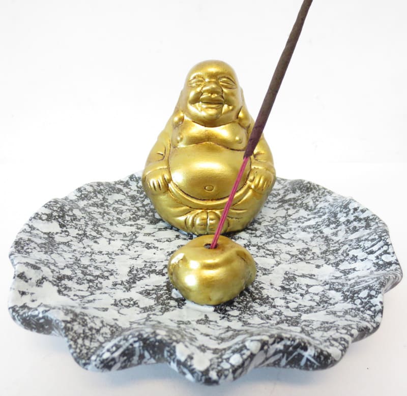 Złoty uchwyt na kadzidełko Happy Buddha szara podstawa 12.50 cm